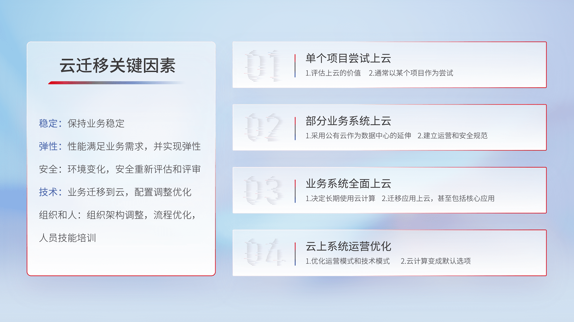 结合实际业务,,从规划设计、、、云平台选型、、、云原生改造、、、数据迁移、、、、集成交付,,,,迁移全过程为客户识别最佳上云路径,,做好风险识别管理,,,设计网络架构、、、、身份权限、、安全审计合规、、、、操作审计、、、日志审计、、监控告警策略、、、多站点容灾设计等,,,对云上基础设施进行整体规划,,,,提升IT治理水平,,,以满足弹性、、、高可用、、、高性能的需求。。